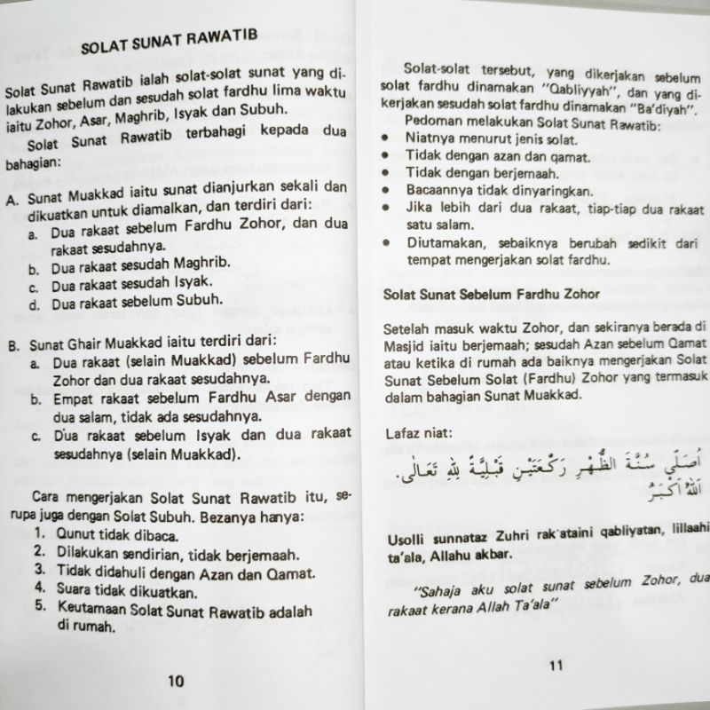 Sebelum qamat atau ketika di rumah ada baiknya mengerjakan solat sunat sebelum solat(fardhu) zohor yang termasuk dalam bahagian sunat muakkad. "sahaja aku solat sunat sebelum zuhur dua rakaat kerana allah taala". • 2 rakaat sebelum solat . Sahaja aku solat sunat sebelum maghrib dua rakaat kerana allah taala. Sahaja aku menunaikan solat sunat (zohor / asar / isyak / subuh) dua rakaat (sebelum / selepas) kerana allah taala. Solat sunat rawatib qabliyyah (sebelum). • 2 rakaat selepas isyak. Sahaja aku menunaikan solat sunat (zohor / asar / isyak / subuh) dua rakaat (sebelum / selepas) kerana .